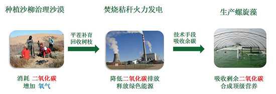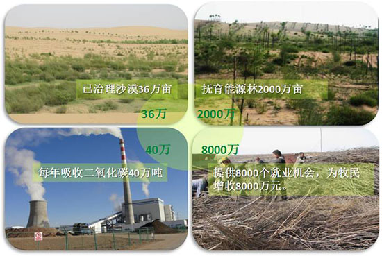 二、碳减排:利用沙柳平茬复长的特性,使沙漠治理余料成为可再生燃料进行发电,产生了新能源。