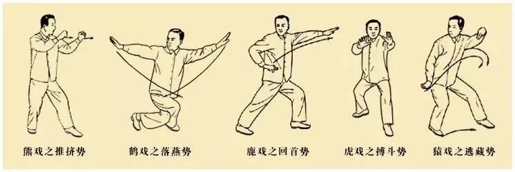 “五禽戏”是我国后汉时期,名医华佗总结了前人模仿禽兽动作锻炼身体的经验,把“熊经鸟伸”运动发展为虎、鹿、熊、猿、鸟“五禽戏”,成为一种行之有效的医疗体育和健身运动。从古至今,广为流传,深为我国人民所喜爱。