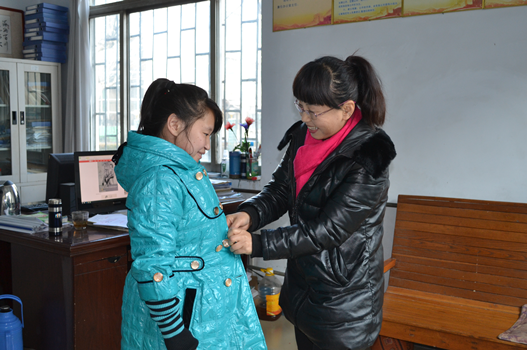 逄赧赧(右一)给家境困难的学生孙叶买了春节新衣服。图片来源:潍坊文明网