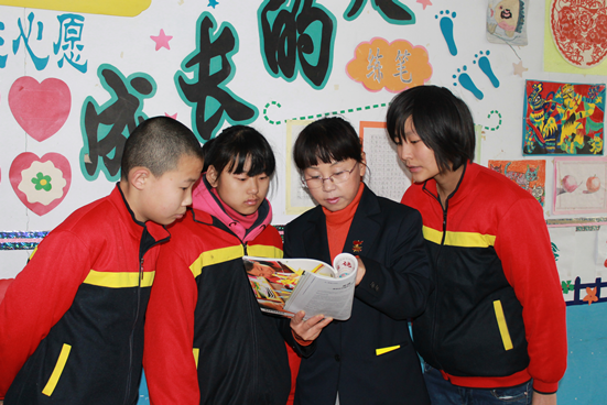 逄赧赧(右二)指导学生阅读。图片来源:潍坊文明网