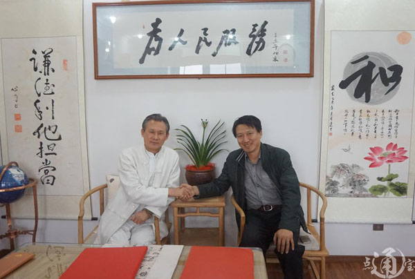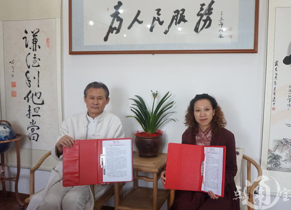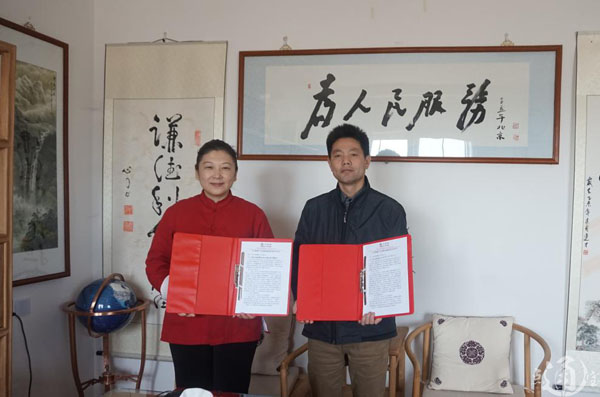 (图为:大健康良心产业联盟代表宋易虹女士(左一)与跃天经纬影视文化传媒(北京)有限公司总编杜勇)